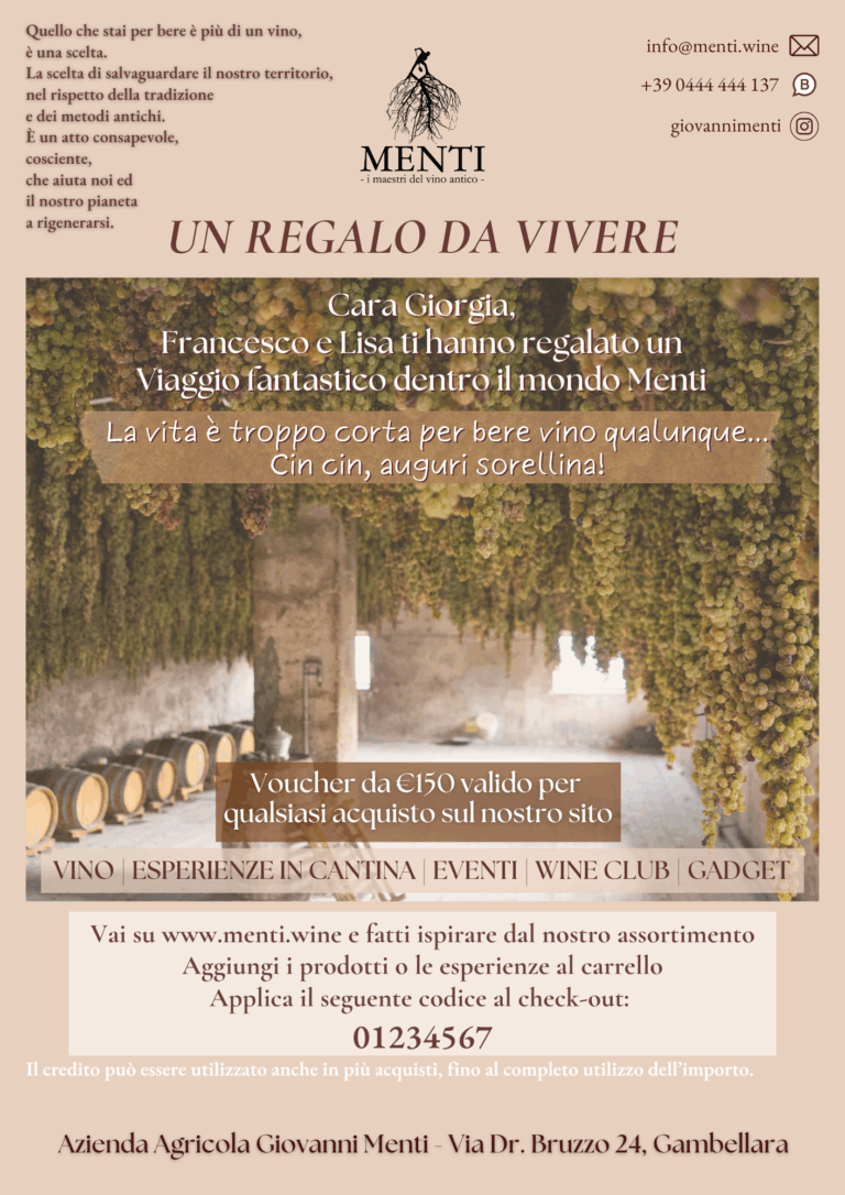 Chi lo riceve potrà utilizzarlo liberamente sul nostro sito per acquistare: vino, visite, degustazioni ed esperienze in cantina, Wine Club e oggetti speciali legati al mondo Menti.
